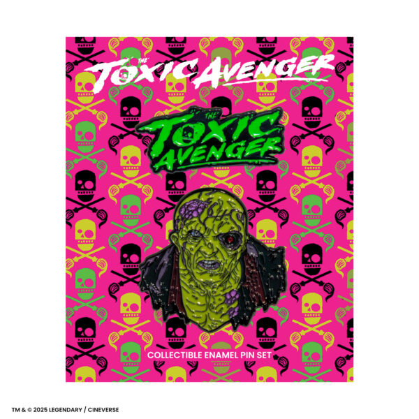 He’s the hero we need now. Based on writer/director Macon Blair’s 2025 reimagining of Lloyd Kaufman’s The Toxic Avenger, this collectible pin set features Toxie himself as seen in the film as well as his namesake logo.
